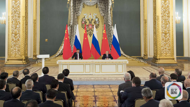 7月4日,國家主席習(xí)近平在莫斯科克里姆林宮同俄羅斯總統(tǒng)普京舉行會(huì)談。會(huì)談后,兩國元首簽署了《中華人民共和國和俄羅斯聯(lián)邦關(guān)于進(jìn)一步深化全面戰(zhàn)略協(xié)作伙伴關(guān)系的聯(lián)合聲明》《中華人民共和國和俄羅斯聯(lián)邦關(guān)于當(dāng)前世界形勢(shì)和重大國際問題的聯(lián)合聲明》,批準(zhǔn)了《〈中華人民共和國和俄羅斯聯(lián)邦睦鄰友好合作條約〉實(shí)施綱要(2017年至2020年)》并見證了《中華人民共和國外交部和俄羅斯聯(lián)邦外交部關(guān)于朝鮮半島問題的聯(lián)合聲明》以及經(jīng)貿(mào)、農(nóng)業(yè)、能源、基礎(chǔ)設(shè)施建設(shè)、金融、文化、創(chuàng)新、媒體、信息網(wǎng)絡(luò)、檢驗(yàn)檢疫等領(lǐng)域多項(xiàng)雙邊合作文件的交換。(新華社記者饒愛民攝)