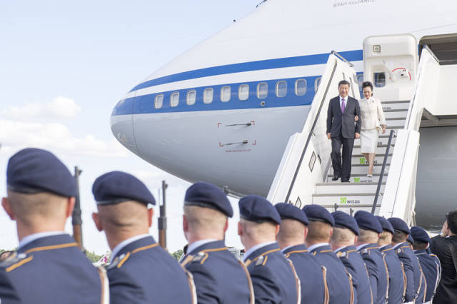 專機(jī)進(jìn)入德國(guó)領(lǐng)空,兩架德國(guó)空軍戰(zhàn)機(jī)升空護(hù)航。專機(jī)抵達(dá)柏林,習(xí)近平主席和夫人彭麗媛步出艙門,現(xiàn)場(chǎng)鳴21響禮炮,戰(zhàn)機(jī)在空中飛越致意。
