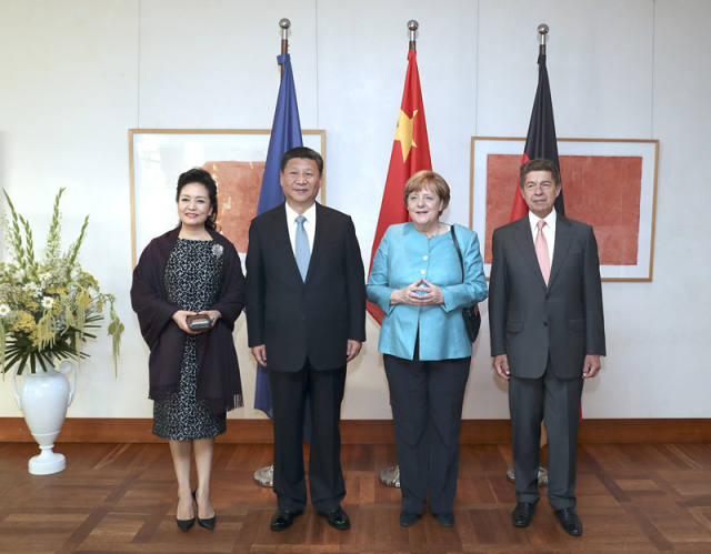 當(dāng)?shù)貢r(shí)間7月4日晚,剛剛抵達(dá)柏林的國(guó)家主席習(xí)近平在利伯曼故居同德國(guó)總理默克爾舉行會(huì)見。這是習(xí)近平和夫人彭麗媛抵達(dá)位于柏林市中心勃蘭登堡門附近的利伯曼故居時(shí),受到默克爾和丈夫紹爾熱情迎接。(新華社記者馬占成攝)