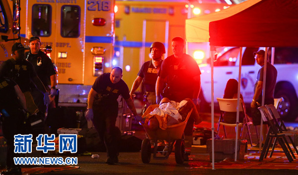 10月1日,在美國西部城市拉斯維加斯,工作人員在槍擊事件現(xiàn)場救治傷者。新華社/美聯(lián)