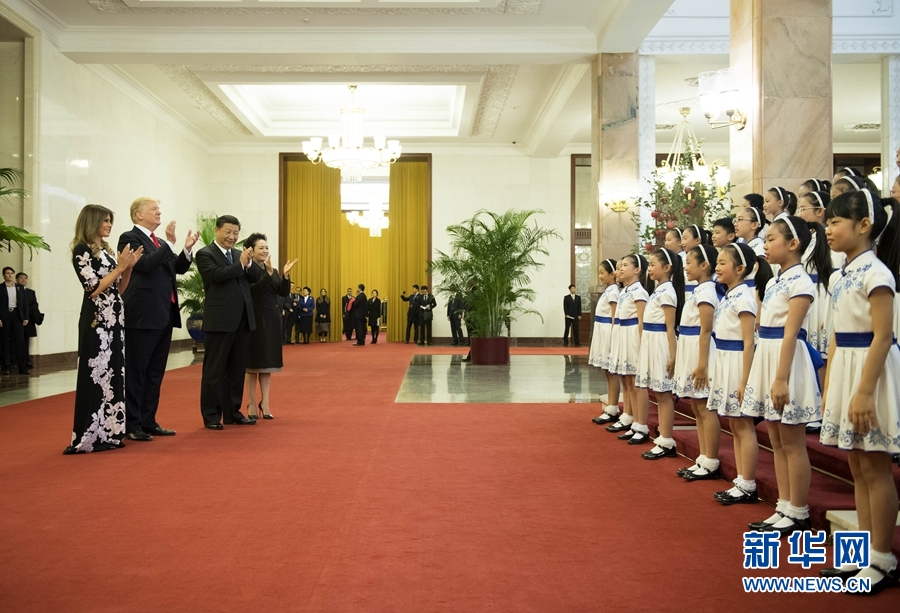11月9日,國家主席習(xí)近平在北京人民大會堂東門外廣場舉行歡迎儀式,歡迎美利堅(jiān)合眾國總統(tǒng)唐納德·特朗普對中國進(jìn)行國事訪問。這是習(xí)近平和夫人彭麗媛同特朗普夫婦在人民大會堂欣賞文藝表演。新華社記者 李學(xué)仁 攝