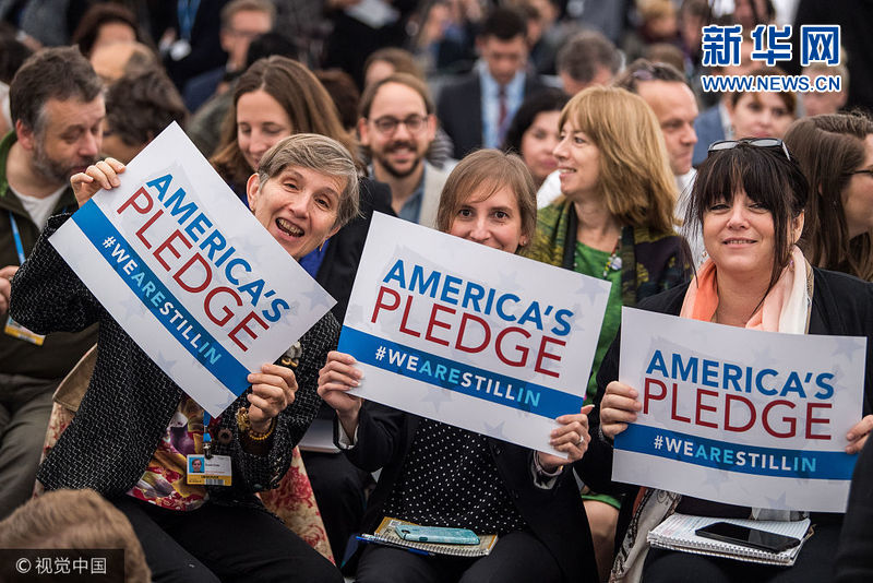 當(dāng)?shù)貢r(shí)間2017年11月11日,德國(guó)波恩,波恩氣候大會(huì)召開(kāi),“美國(guó)會(huì)館”內(nèi)景。雖然美國(guó)宣布退出了《巴黎協(xié)定》,但美國(guó)氣候談判代表仍出席了波恩的會(huì)議。美國(guó)除聯(lián)邦外的各級(jí)政府均派代表參加波恩會(huì)議,且主要目的就是表明他們?nèi)詫⒅铝τ趦冬F(xiàn)美國(guó)在巴黎做出的承諾。在美國(guó)國(guó)內(nèi),成千上萬(wàn)的市長(zhǎng)、州長(zhǎng)、部落首領(lǐng)、企業(yè)高管以及普通美國(guó)人都在努力降低溫室氣體排放。這個(gè)名為“我們?nèi)栽趫?jiān)守(We Are Still In)”的聯(lián)盟的成員代表了美國(guó)一半以上的人口以及54%的經(jīng)濟(jì)產(chǎn)出。“我們?nèi)栽趫?jiān)守”( We Are Still In)、“美國(guó)氣候聯(lián)盟”、“氣候市長(zhǎng)”(Climate Mayors)和其它諸多計(jì)劃向全世界傳遞了這樣一個(gè)信息,即美國(guó)仍然有很多人正致力于擁有宏偉目標(biāo)的氣候行動(dòng)之中,而“美國(guó)的承諾”(America’s Pledge)正在尋求如何量化并傳播這些承諾。(圖片來(lái)源:視覺(jué)中國(guó))
