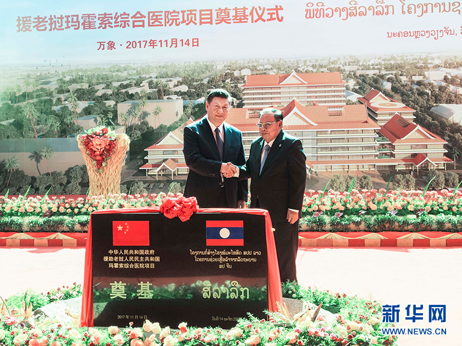 11月14日,中共中央總書記、國家主席習(xí)近平同老撾人民革命黨中央委員會(huì)總書記、國家主席本揚(yáng)在萬象一道出席瑪霍索綜合醫(yī)院奠基儀式。新華社記者 馬占成 攝