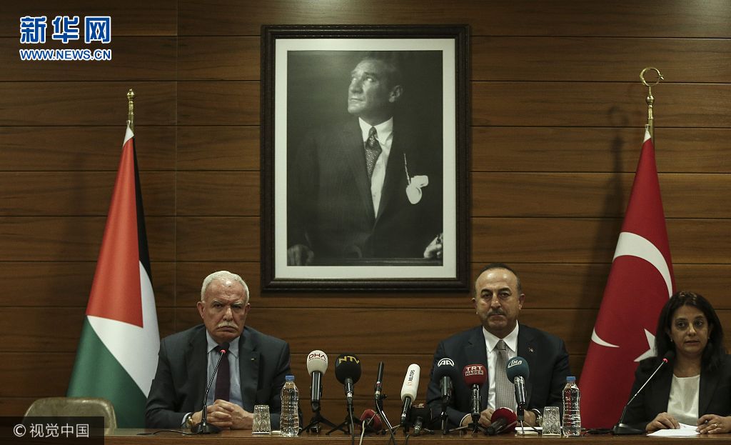 當(dāng)?shù)貢r間2017年12月20日,土耳其伊斯坦布爾,土耳其外長恰武什奧盧與巴勒斯坦外長馬勒基舉行聯(lián)合新聞發(fā)布會,呼吁聯(lián)合國大會在21日舉行的緊急會議上認(rèn)定美國承認(rèn)耶路撒冷為以色列首都的決定“無效”。(圖片來源:視覺中國)