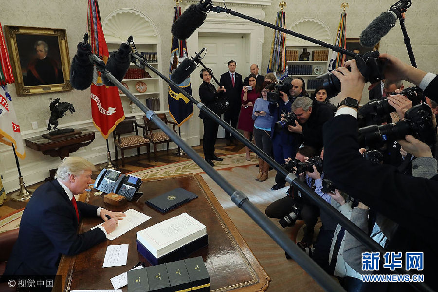 當?shù)貢r間22日,美國華盛頓,美國總統(tǒng)特朗普在白宮的橢圓形辦公室簽署1.5萬億美元稅改法案,此乃美國最近逾30年來最大規(guī)模減稅行動。(圖片來源:視覺中國)