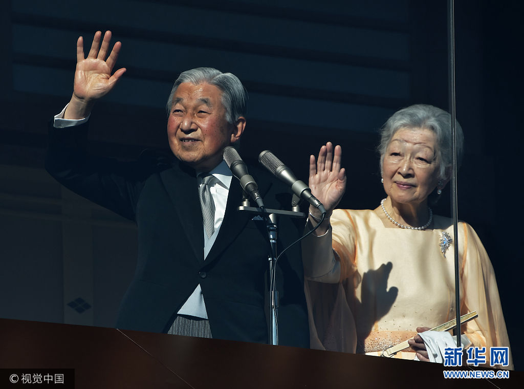 當(dāng)?shù)貢r(shí)間2017年12月23日,日本東京,日本明仁天皇慶祝84歲生日,在皇宮的陽(yáng)臺(tái)上向祝福者揮手致意。(圖片來(lái)源:視覺(jué)中國(guó))