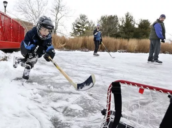 人們在結(jié)了冰的池塘上面打冰球