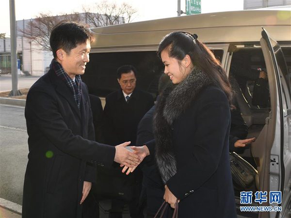 1月21日,朝鮮三池淵管弦樂(lè)團(tuán)團(tuán)長(zhǎng)玄松月(右)到達(dá)位于朝韓邊境的韓國(guó)京畿道坡州市京義線韓朝出入境事務(wù)所。新華社發(fā)(韓國(guó)統(tǒng)一部提供)