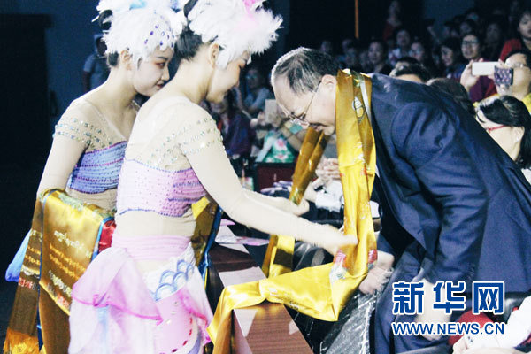 藝術(shù)團(tuán)演員為現(xiàn)場(chǎng)貴賓敬獻(xiàn)哈達(dá)。