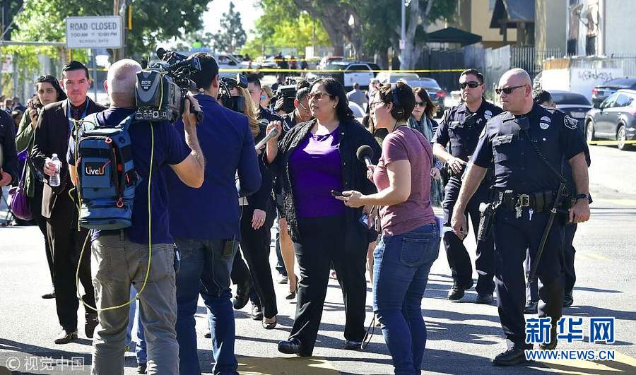 2月1日,美國(guó)洛杉磯,洛杉磯薩斯卡斯特羅(Sal Castro)中學(xué)發(fā)生槍擊案,已致2名學(xué)生送醫(yī),且傷情不明。警方表示,現(xiàn)場(chǎng)情況已經(jīng)得到控制,開(kāi)槍的女學(xué)生已被羈押。但警方并未透露該學(xué)生的年齡和姓名。(圖片來(lái)源:視覺(jué)中國(guó))