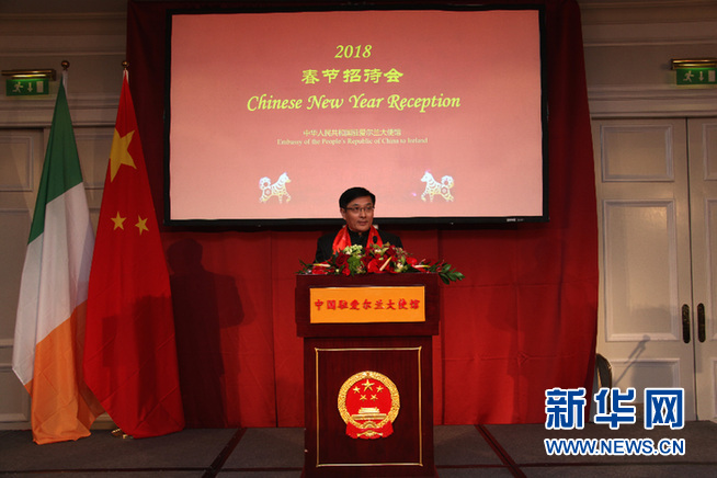 2月8日, 在愛爾蘭首都都柏林, 中國駐愛爾蘭大使岳曉勇在春節(jié)招待會上致辭。新華網(wǎng)發(fā)(張琪攝)