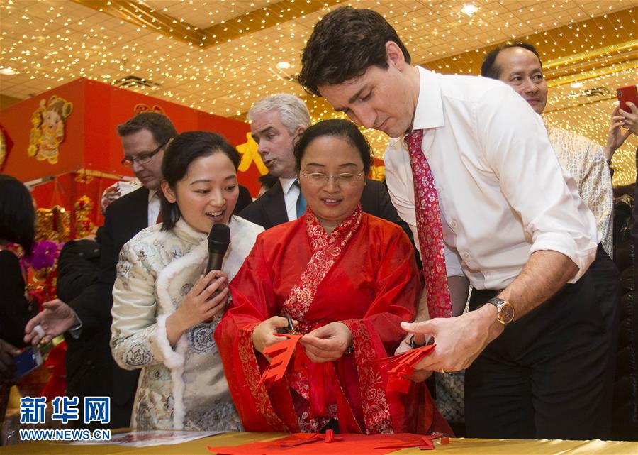 2月15日,在加拿大安大略省米西索加市,總理特魯多(右)向來自中國四川的剪紙藝人學習剪紙。加拿大總理特魯多15日來到安大略省米西索加市逛年貨大街,向當?shù)厝A人華僑拜年,共慶中國狗年春節(jié)。新華社發(fā)(鄒崢攝)
