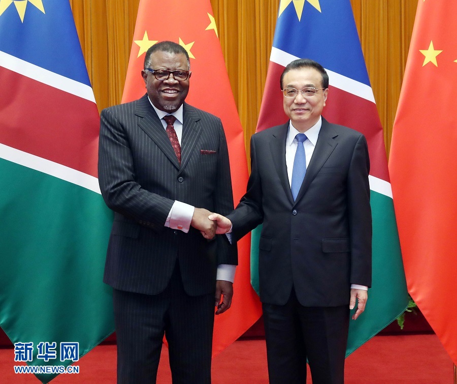 3月30日,國(guó)務(wù)院總理李克強(qiáng)在北京人民大會(huì)堂會(huì)見(jiàn)來(lái)華進(jìn)行國(guó)事訪(fǎng)問(wèn)的納米比亞總統(tǒng)根哥布。新華社記者 劉衛(wèi)兵 攝