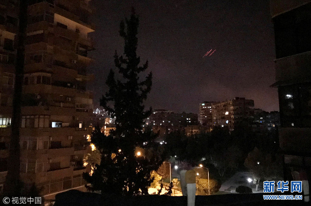 4月14日,敘利亞大馬士革,特朗普決定聯(lián)合英國(guó)和法國(guó)對(duì)敘利亞進(jìn)行精確打擊,大馬士革傳出爆炸聲,敘利亞方面進(jìn)行反擊。敘利亞阿拉伯?dāng)⒗麃喭ㄓ嵣?SANA)報(bào)道,敘政府軍在大馬士革以南地區(qū)擊落13枚導(dǎo)彈。敘利亞國(guó)家電視臺(tái)此前稱美英法三國(guó)對(duì)敘利亞“發(fā)動(dòng)了侵略”。(圖片來源:視覺中國(guó))