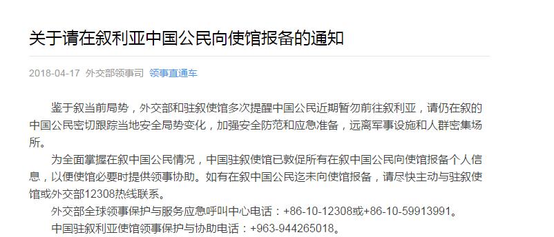 中國(guó)駐敘利亞使館領(lǐng)事保護(hù)與協(xié)助電話(huà):+963-944265018。