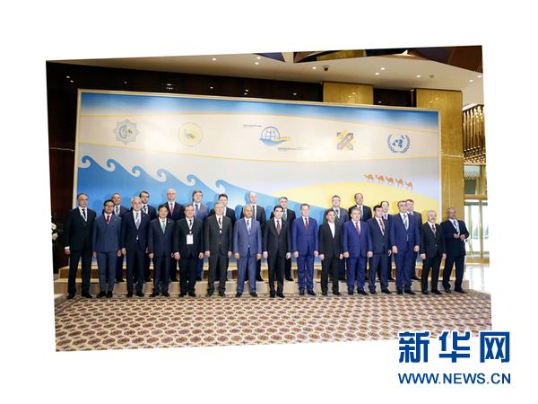 參加“偉大的絲綢之路——邁向新發(fā)展”國際論壇的貴賓同土庫曼斯坦總統(tǒng)別爾德穆哈梅多夫合影。新華社記者 周良攝