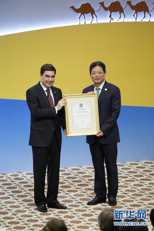 論壇開幕式上,絲綢之路國際總商會主席呂建中代表該商會向別爾德穆哈梅多夫頒發(fā)“復(fù)興絲綢之路榮譽(yù)證書”。新華社記者 周良攝