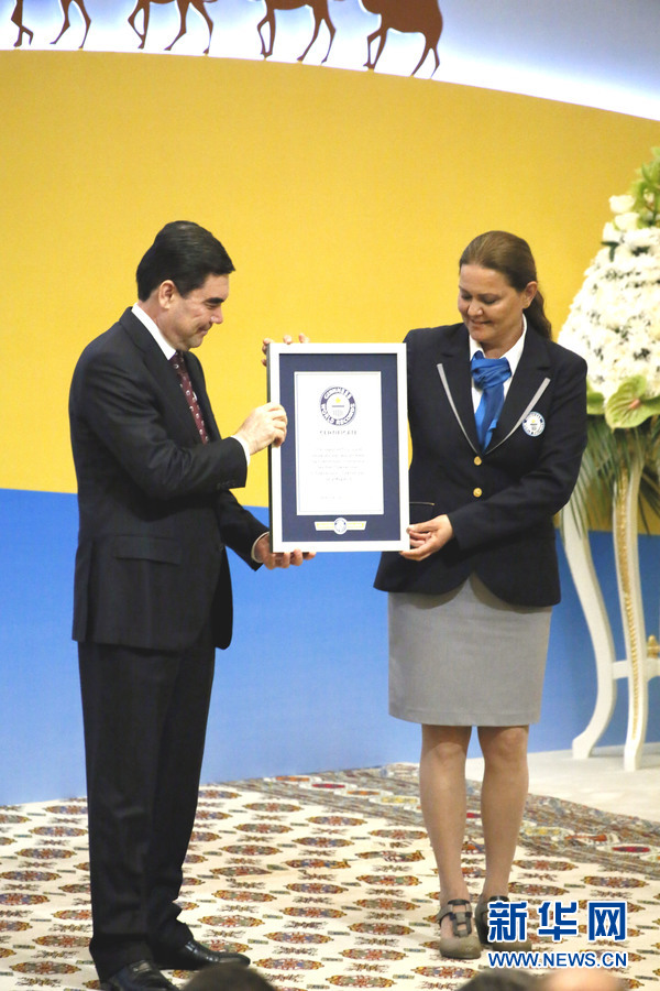 5月2日,世界吉尼斯紀(jì)錄總部的代表向土庫曼斯坦總統(tǒng)頒發(fā)相關(guān)證書。新華社記者 周良攝