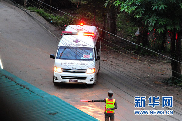這是7月8日在泰國清萊拍攝的運(yùn)送被解救出的少年足球隊(duì)員的救護(hù)車。新華社發(fā)(拉亨 攝)