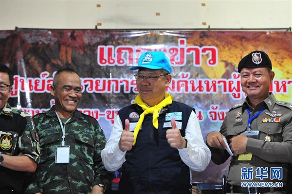 7月10日,在泰國清萊,清萊府府尹那榮薩(右二)在新聞發(fā)布會(huì)上慶祝救援成功。新華社發(fā)(拉亨 攝)