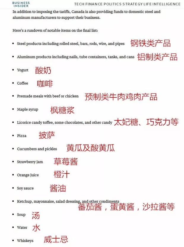 美國(guó)網(wǎng)站Business Insider貼心做了個(gè)大致梳理,不難看出,這份后續(xù)打擊清單,正如加拿大廣播公司評(píng)論所說(shuō),乍看上去簡(jiǎn)直像是家庭主婦去超市的購(gòu)物單:從比薩餅到草莓醬,從威士忌到酸黃瓜,跟第一輪打擊的鋼鋁顯得實(shí)在不匹配。