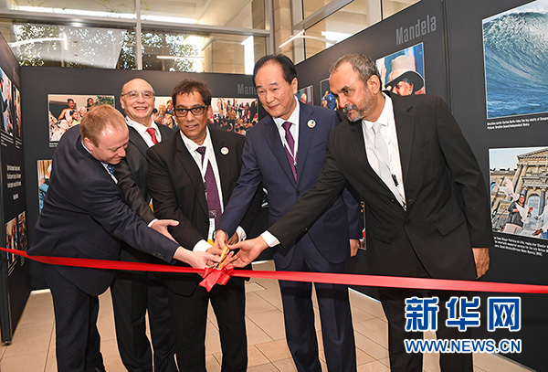 7月18日,在南非開普敦,金磚國家媒體主席團(tuán)成員為聯(lián)合攝影展開幕剪彩。新華社記者陳誠攝