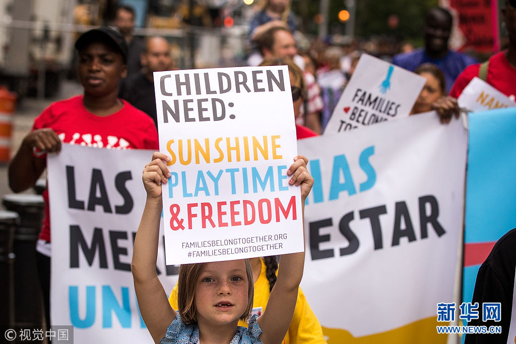 當(dāng)?shù)貢r(shí)間2018年7月18日,美國(guó)紐約,包括托兒所從業(yè)人員、父母及其子女在內(nèi)的社會(huì)各界人士在美國(guó)移民和海關(guān)執(zhí)法局(ICE)附近組織示威游行,抗議特朗普政府近期在美國(guó)南部邊境實(shí)施針對(duì)非法移民家庭的強(qiáng)制拘留和家庭成員離散政策。 當(dāng)天,共和黨領(lǐng)導(dǎo)的眾議院通過(guò)了支持ICE的決議,并譴責(zé)一些民主黨人和進(jìn)步積極分子要求廢除ICE的呼聲。(圖片來(lái)源:視覺(jué)中國(guó))