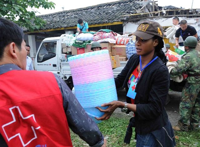 2008年5月17日,在“5·12”汶川特大地震重災(zāi)區(qū)四川省什邡市湔氐鎮(zhèn)白虎頭村,來自非洲的志愿者瑪利亞在搬運(yùn)救援物資。 新華社記者劉海峰攝