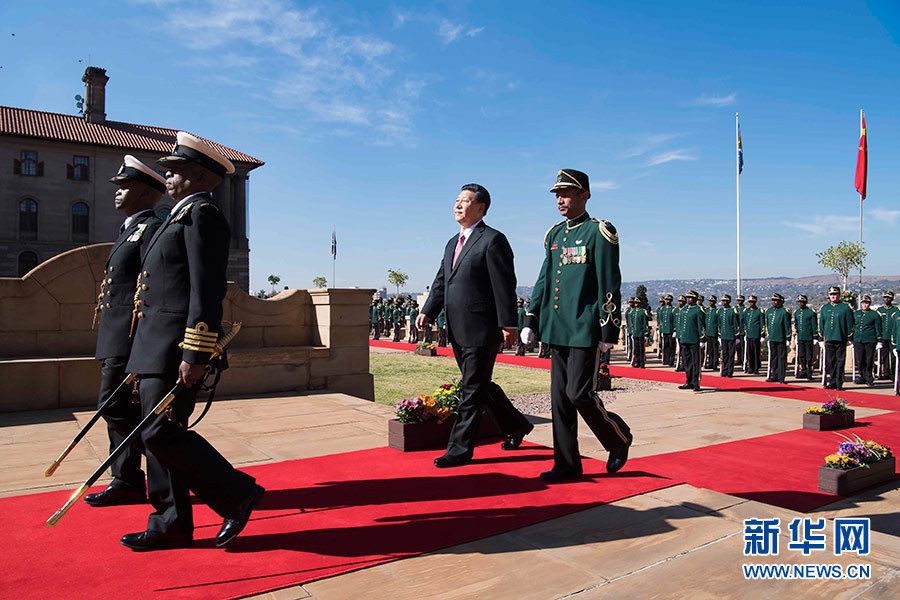 總統(tǒng)府前廣場(chǎng),微風(fēng)拂面,陽光和煦。中南兩國國旗迎風(fēng)飄揚(yáng)。習(xí)近平和夫人彭麗媛受到拉馬福薩和夫人莫采佩熱情迎接。兩國元首夫婦登上檢閱臺(tái)。儀仗隊(duì)行持槍禮。軍樂隊(duì)奏中國國歌?,F(xiàn)場(chǎng)鳴放21響禮炮。習(xí)近平檢閱儀仗隊(duì)。軍樂隊(duì)奏南非國歌。習(xí)近平和彭麗媛同南方主要官員握手。拉馬福薩夫婦同中方陪同人員握手。兩國元首夫婦親切寒暄。拉馬福薩對(duì)習(xí)近平在南中建交20周年之際訪問南非并出席金磚國家領(lǐng)導(dǎo)人會(huì)晤表示熱烈歡迎。