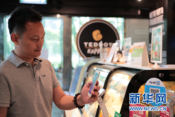 8月8日,在馬來西亞吉隆坡,一名男士用電子錢包刷二維碼買咖啡。 新華社記者 朱煒 攝