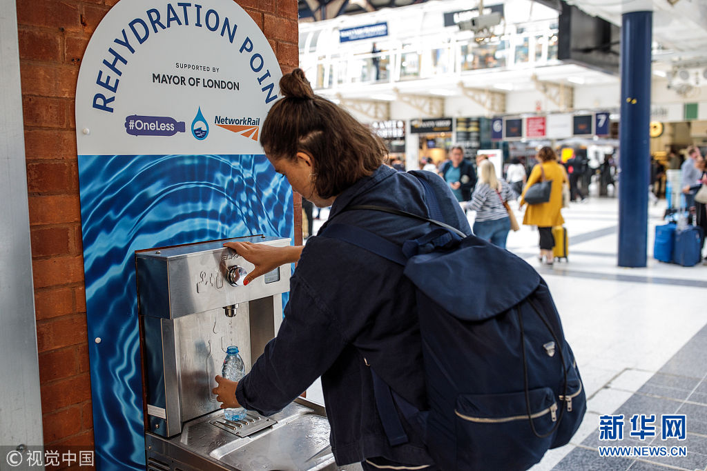 當(dāng)?shù)貢r間2018年8月28日,英國倫敦,民眾在公共飲水機旁飲水。倫敦市長近日引進(jìn)了20個新的公共飲水機,鼓勵人們自帶杯子取水喝,從而減少塑料垃圾。 (圖片來源:視覺中國)