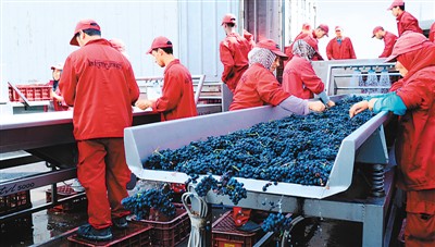 圖為摩洛哥一家酒莊的工人對(duì)葡萄進(jìn)行清洗加工準(zhǔn)備釀酒。葡萄酒將借首屆國(guó)際進(jìn)博會(huì)來(lái)到中國(guó)。新華社記者 陳斌杰攝