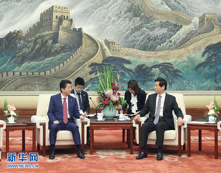 10月26日,全國人大常委會(huì)委員長栗戰(zhàn)書在北京人民大會(huì)堂會(huì)見日本首相安倍晉三。 新華社記者劉衛(wèi)兵攝