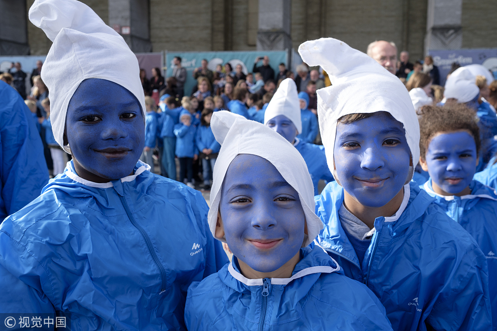 當(dāng)?shù)貢r(shí)間2018年10月23日,比利時(shí)布魯塞爾,民眾參加動(dòng)畫形象“藍(lán)精靈”60歲慶?;顒?dòng)。(圖片來源:視覺中國)