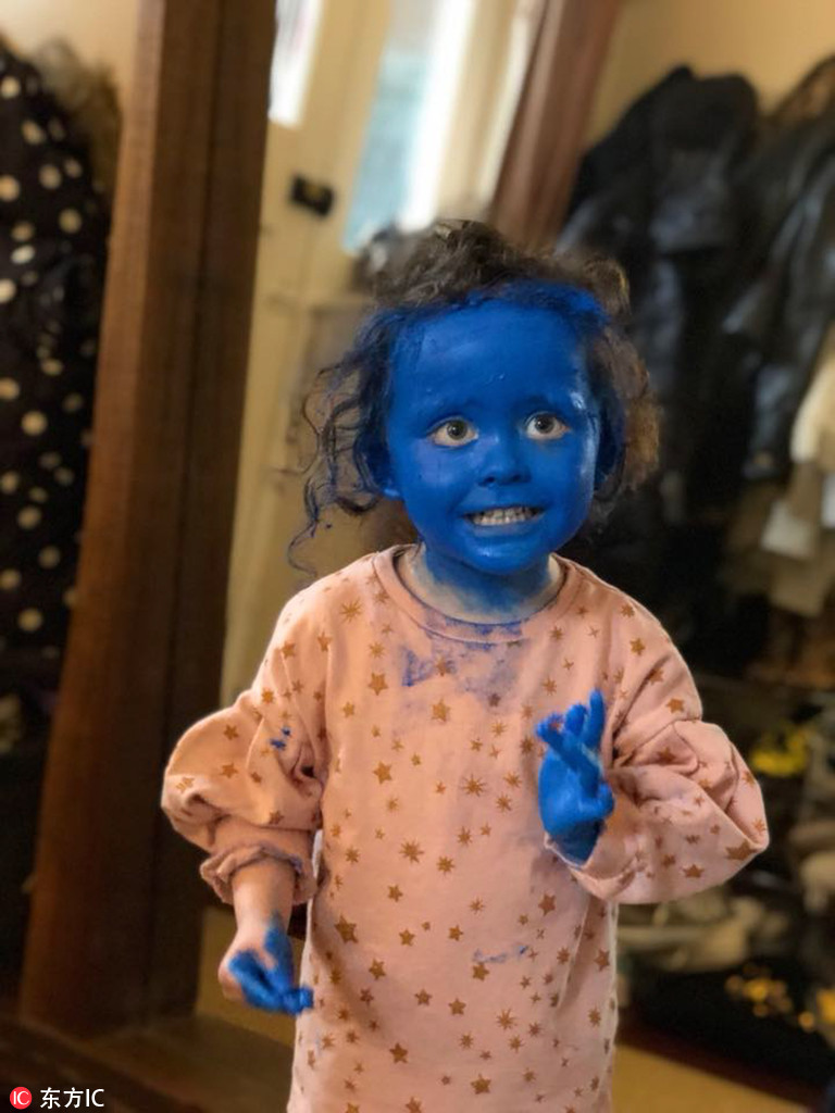 2018年4月17日?qǐng)?bào)道,國外3歲的小女孩Eve把自己涂抹成了“藍(lán)精靈”?。▓D片來源:東方IC)