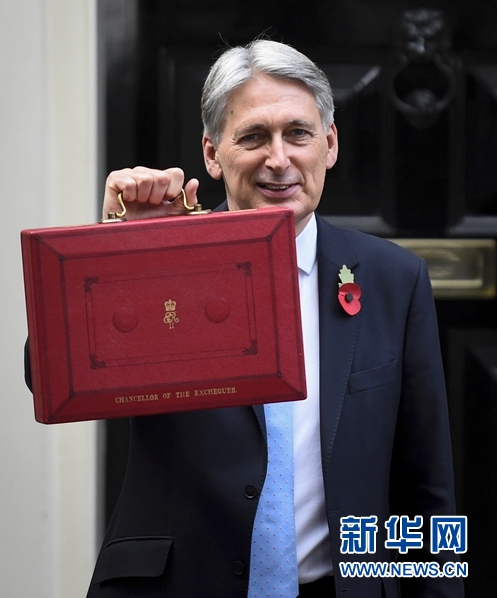 10月29日,在英國倫敦,英國財(cái)政大臣菲利普·哈蒙德展示手中的“預(yù)算盒”,準(zhǔn)備向議會(huì)提交預(yù)算案。當(dāng)天他在議會(huì)公布預(yù)算案時(shí)表示,英國將結(jié)束財(cái)政緊縮,努力爭取“脫歐”最好結(jié)果的同時(shí),為“脫歐”各種可能性做好準(zhǔn)備。 新華社發(fā)(史蒂芬·程 攝)