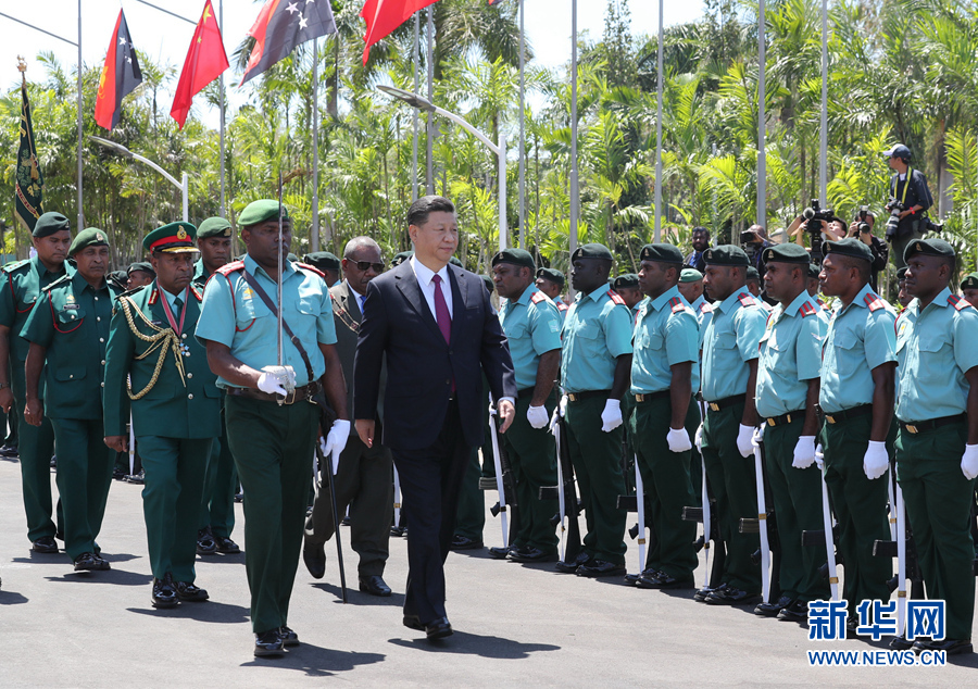 11月16日,國家主席習(xí)近平在莫爾茲比港會見巴布亞新幾內(nèi)亞總督達達埃。會見開始前,達達埃在議會大廈前廣場為習(xí)近平舉行隆重歡迎儀式。 新華社記者 鞠鵬 攝