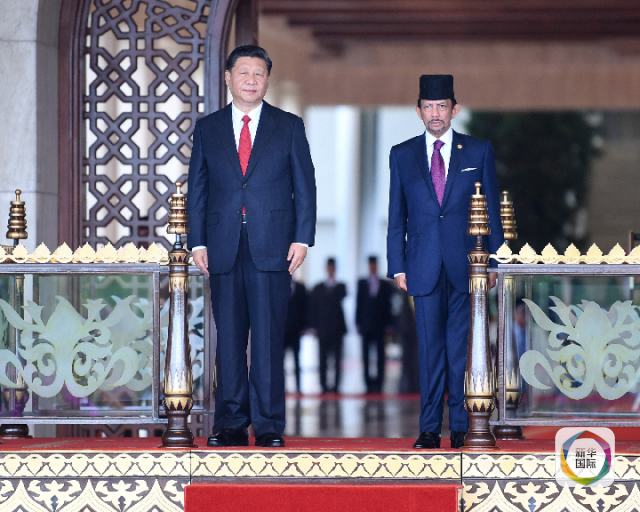11月19日,國家主席習(xí)近平在斯里巴加灣同文萊蘇丹哈桑納爾舉行會談。這是會談開始前,習(xí)近平出席哈桑納爾在王宮前廣場舉行的盛大歡迎儀式。 新華社記者 燕雁 攝