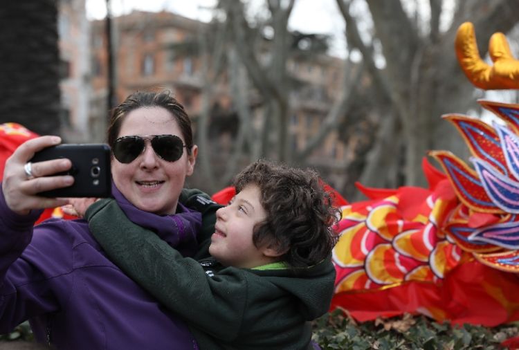 2019年2月10日在意大利羅馬,一對(duì)母子在羅馬僑界歡度2019年春節(jié)活動(dòng)上自拍。(新華社記者程婷婷攝)