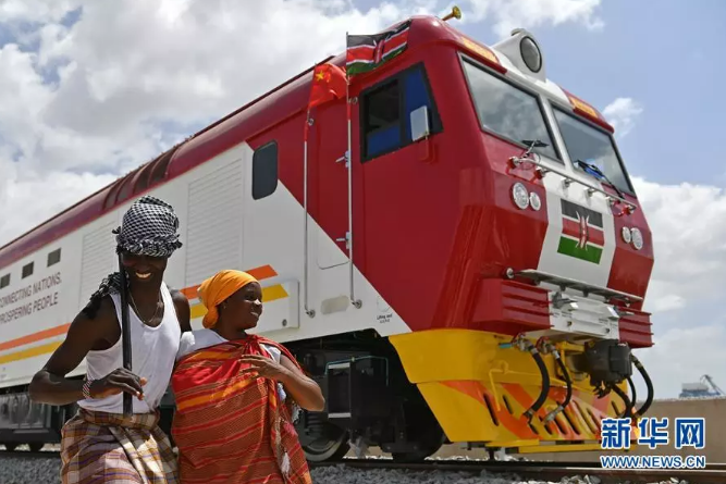 2017年1月11日,在肯尼亞蒙巴薩,當(dāng)?shù)孛癖娫谥袊兄频拿蓛?nèi)鐵路首批內(nèi)燃機(jī)車旁載歌載舞。新華社記者孫瑞博攝