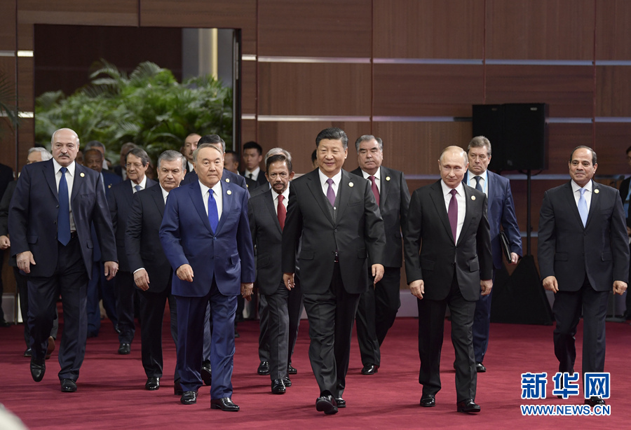 4月26日,國家主席習(xí)近平在北京出席第二屆“一帶一路”國際合作高峰論壇開幕式,并發(fā)表題為《齊心開創(chuàng)共建“一帶一路”美好未來》的主旨演講。這是習(xí)近平和出席開幕式的外方領(lǐng)導(dǎo)人共同步入會場。 新華社記者李學(xué)仁攝