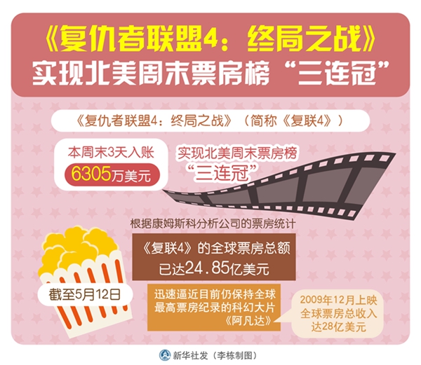 根據(jù)康姆斯科分析公司的票房統(tǒng)計,截至5月12日,《復(fù)聯(lián)4》的全球票房總額已達24.85億美元,迅速逼近目前仍保持全球最高票房紀(jì)錄的科幻大片《阿凡達》。2009年12月上映的《阿凡達》由著名導(dǎo)演詹姆斯·卡梅隆執(zhí)導(dǎo),全球票房總收入達28億美元。