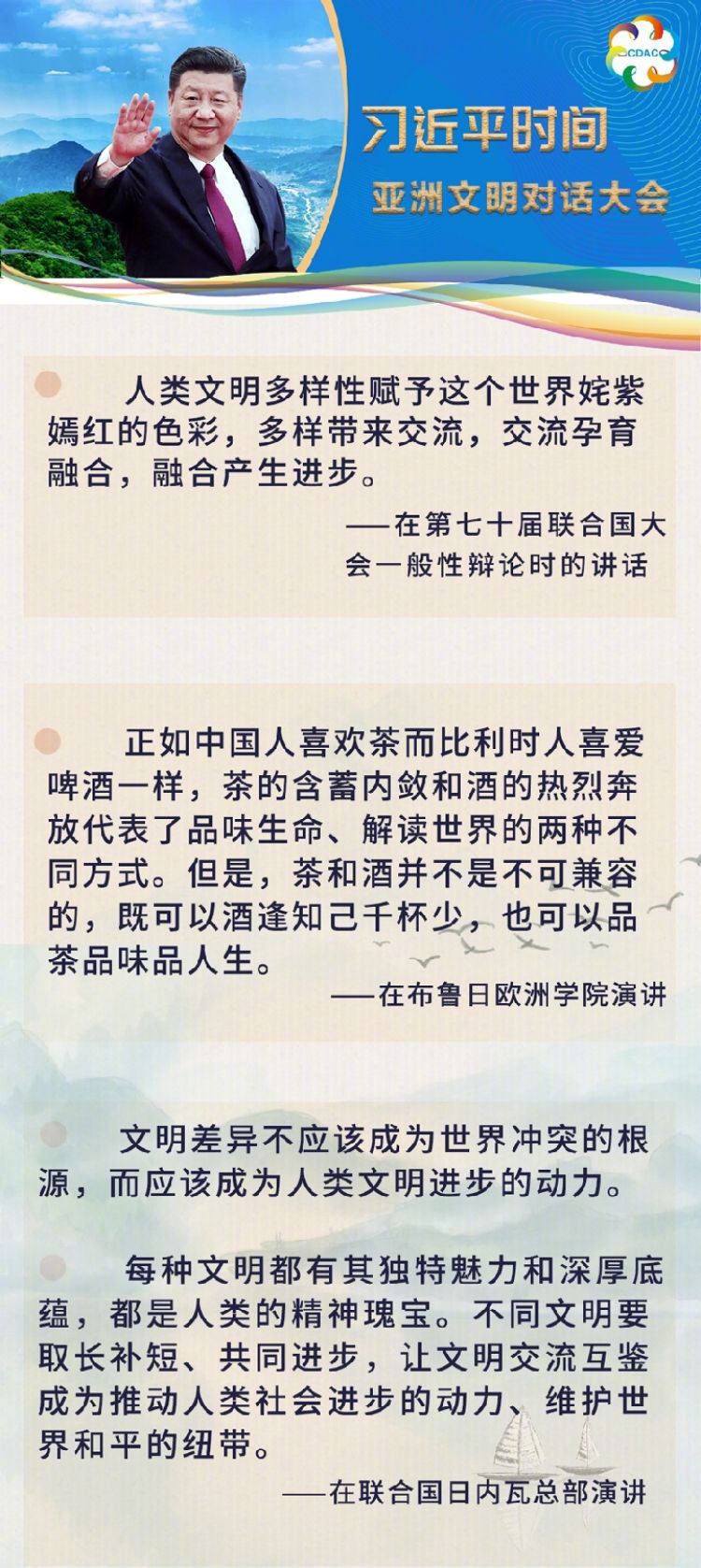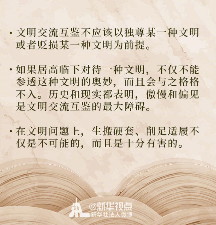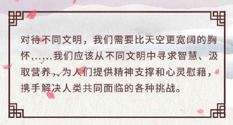 在這次演講中,習(xí)近平主席用生動(dòng)的語言講明了對待不同文明應(yīng)有的態(tài)度和原則: