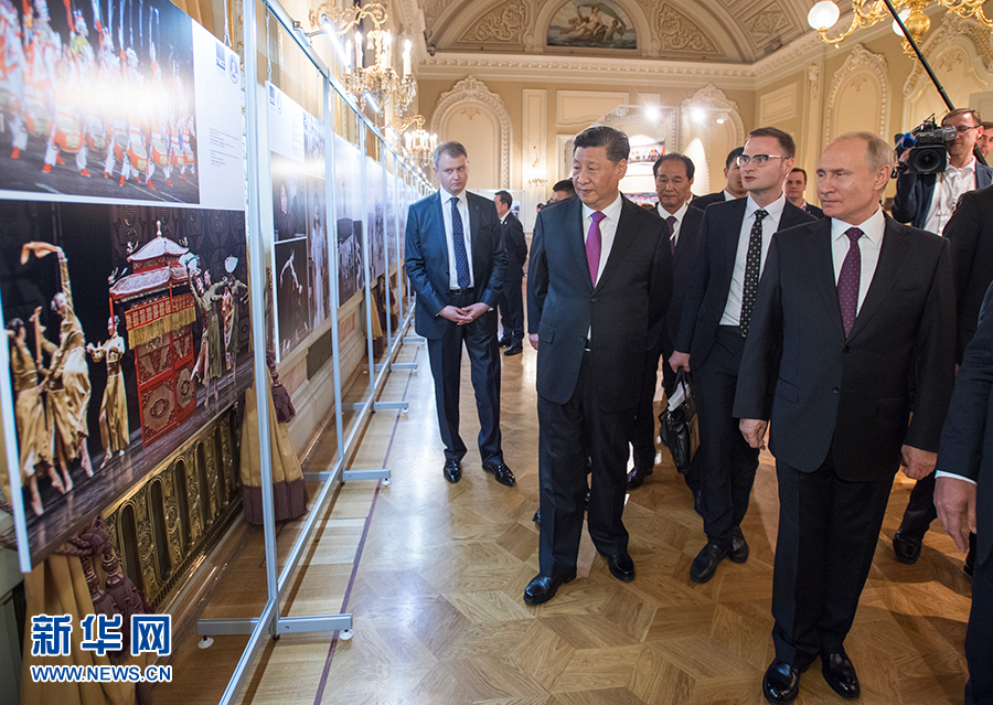 6月5日,國家主席習近平和俄羅斯總統(tǒng)普京在莫斯科大劇院共同出席中俄建交70周年紀念活動。這是兩國元首共同參觀中俄建交70周年圖片展。 新華社記者 李學仁 攝