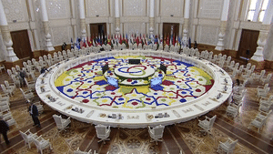 15日上午,杜尚別納烏魯茲宮,習(xí)主席出席亞洲相互協(xié)作與信任措施會議第五次峰會。圓桌會議開始后,亞信主席國元首拉赫蒙總統(tǒng)邀請習(xí)主席第一個發(fā)言。