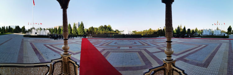 儀仗隊在塔吉克斯坦總統(tǒng)府列隊,等候兩國元首檢閱。遠處高聳的旗桿位于總統(tǒng)府外的國旗公園,高165米,是杜尚別的地標建筑之一。新華社記者 霍小光 攝