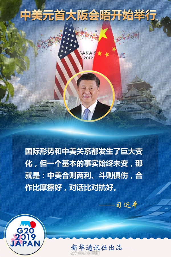 習(xí)近平在會(huì)晤開始時(shí)說,很高興同總統(tǒng)先生在大阪見面。48年前,也就是1971年,就在離這里100多公里的名古屋,參加第三十一屆世界乒乓球錦標(biāo)賽的中美乒乓球運(yùn)動(dòng)員進(jìn)行了友好互動(dòng),這就是后來人們說的“乒乓外交”的開啟,創(chuàng)造了“小球轉(zhuǎn)動(dòng)大球”的歷史佳話。8年之后的1979年,中美建立了外交關(guān)系?;仡櫧ń灰詠淼?0年,國(guó)際形勢(shì)和中美關(guān)系都發(fā)生了巨大變化,但一個(gè)基本的事實(shí)始終未變,那就是:中美合則兩利、斗則俱傷,合作比摩擦好,對(duì)話比對(duì)抗好。近來,我同總統(tǒng)先生通過電話和書信保持著密切聯(lián)系。今天,我愿同總統(tǒng)先生就事關(guān)中美關(guān)系發(fā)展的根本性問題交換意見,為下階段兩國(guó)關(guān)系發(fā)展定向把舵,推進(jìn)以協(xié)調(diào)、合作、穩(wěn)定為基調(diào)的中美關(guān)系。