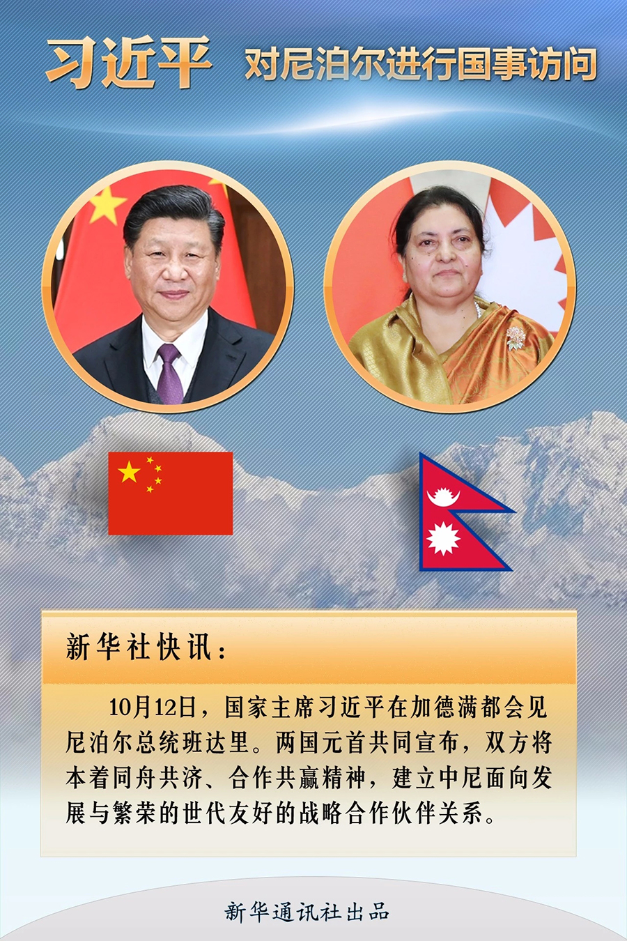 新華社加德滿都10月12日電 10月12日,國家主席習(xí)近平在加德滿都會(huì)見尼泊爾總統(tǒng)班達(dá)里。兩國元首共同宣布,雙方將本著同舟共濟(jì)、合作共贏精神,建立中尼面向發(fā)展與繁榮的世代友好的戰(zhàn)略合作伙伴關(guān)系。