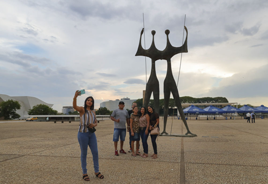 這是2019年11月2日,游人在巴西利亞三權(quán)廣場首都開拓者雕像前合影。新華社記者蘭紅光攝