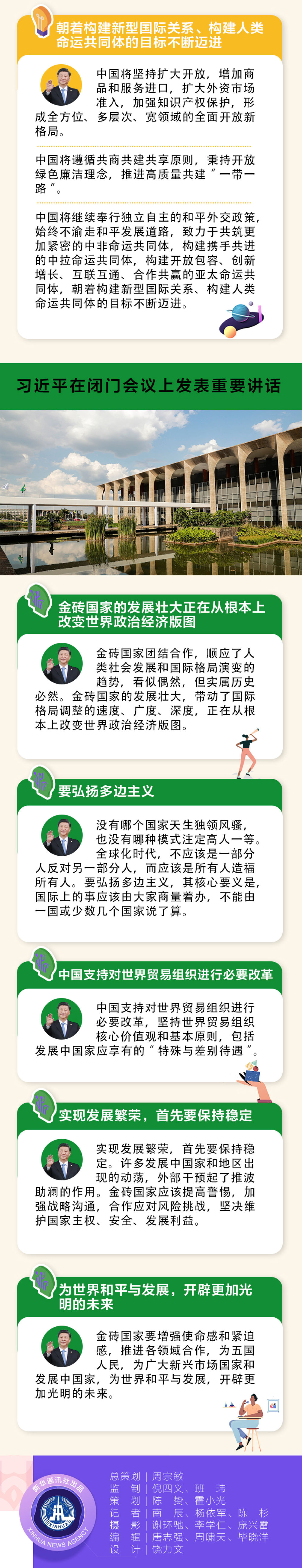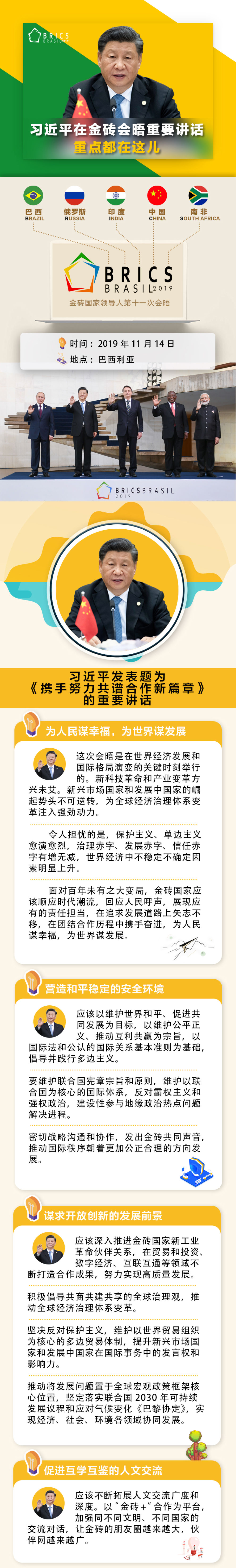 當(dāng)?shù)貢r間11月14日,金磚國家領(lǐng)導(dǎo)人第十一次會晤在巴西首都巴西利亞舉行。巴西總統(tǒng)博索納羅主持會晤。中國國家主席習(xí)近平、俄羅斯總統(tǒng)普京、印度總理莫迪、南非總統(tǒng)拉馬福薩出席。習(xí)近平發(fā)表題為《攜手努力共譜合作新篇章》的重要講話。當(dāng)天,金磚國家領(lǐng)導(dǎo)人還舉行閉門會議,習(xí)近平在會上發(fā)表重要講話。
